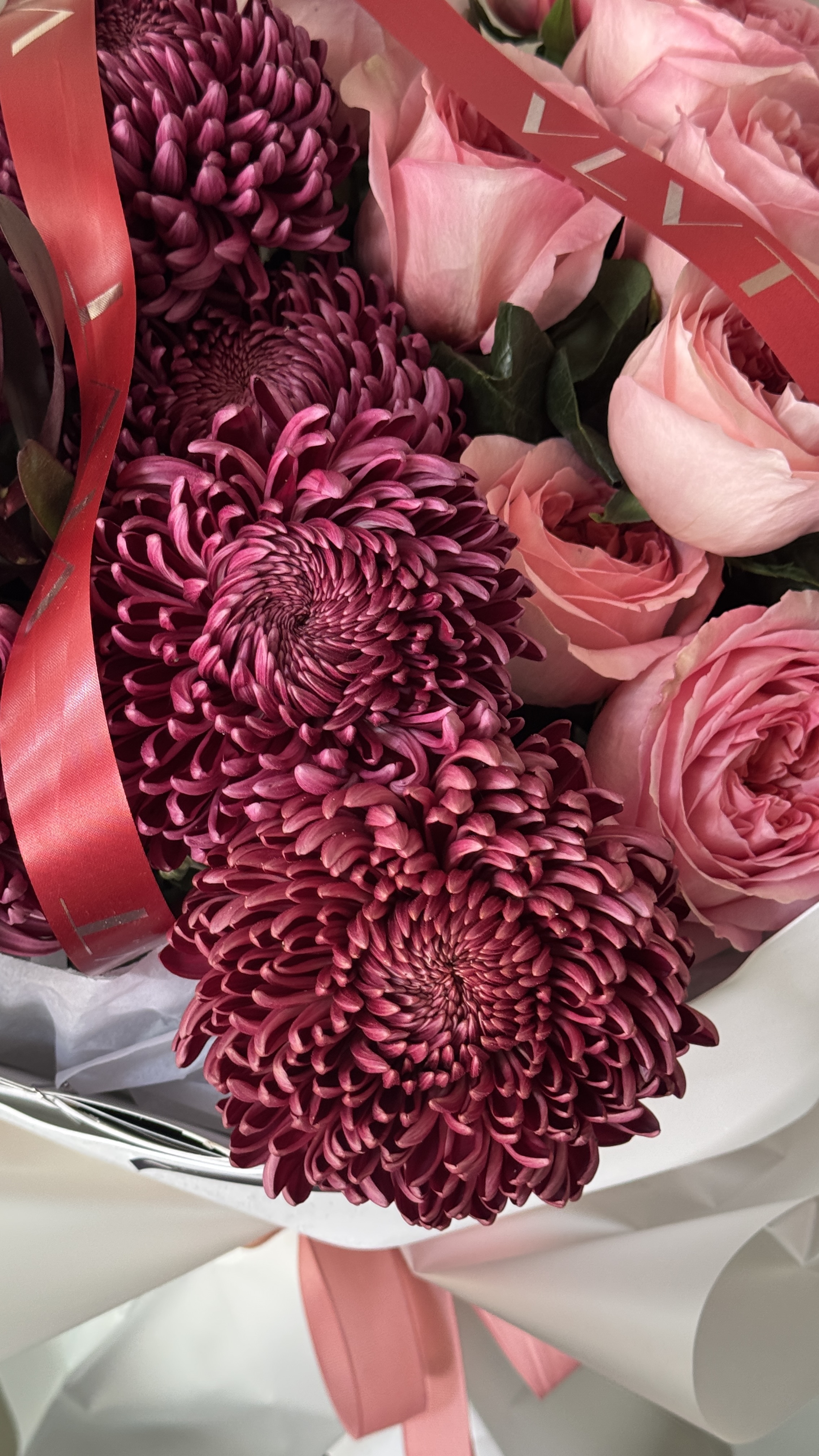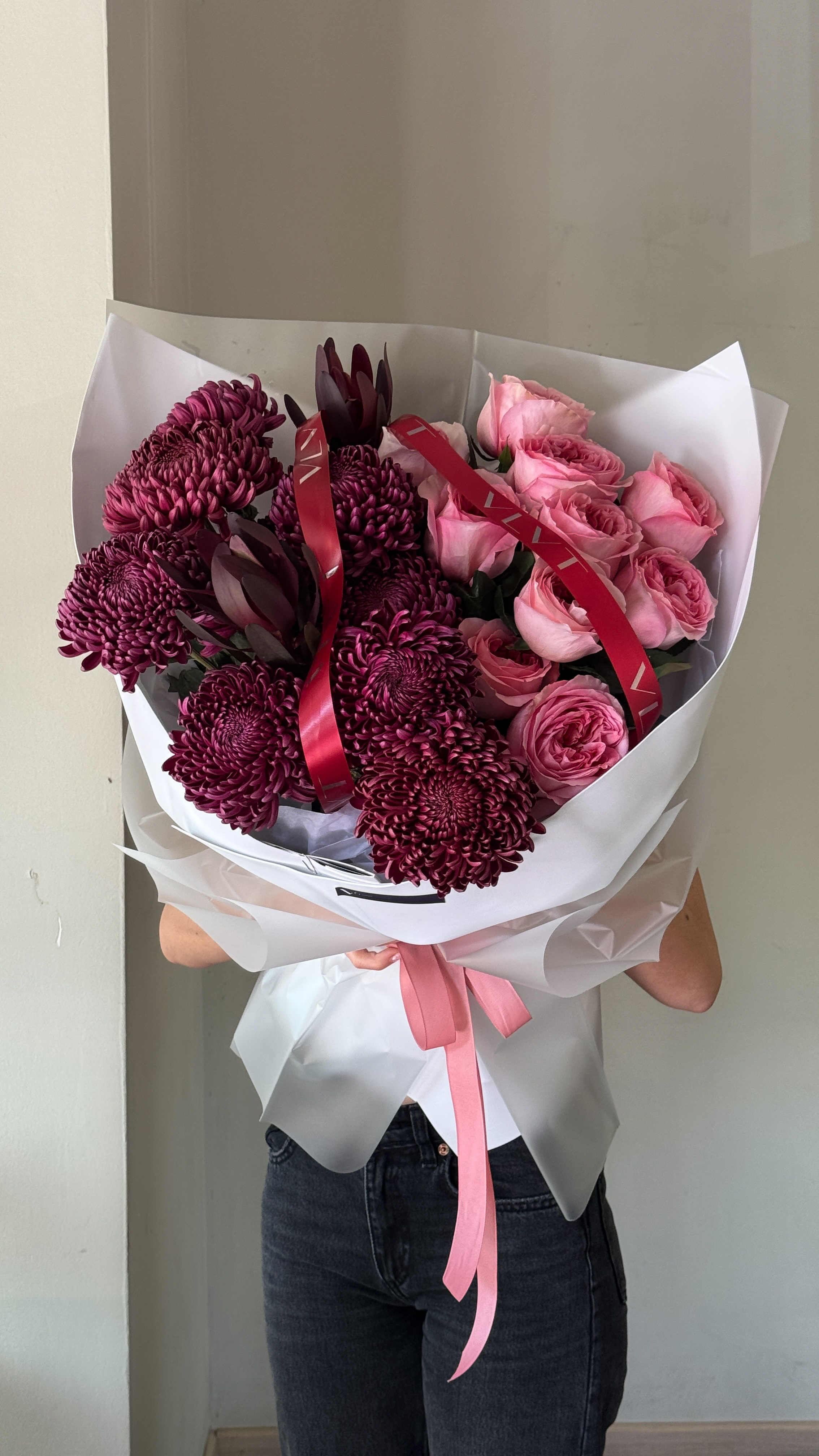 Роскошный букет из пионовидных цветов и шикарных хризантем Бигуди